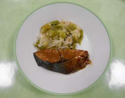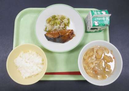 今日の献立は、「ごはん、牛乳、ふくらぎの照り焼き、野菜のピリ辛炒め、五目みそ汁」でした。