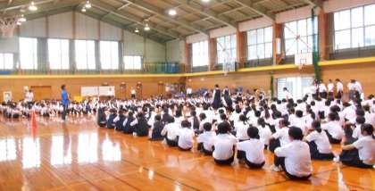 先日行われた県中学校駅伝競走大会に出場した選手たちの健闘を讃えて、全校生徒から温かい拍手が贈られました。