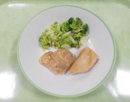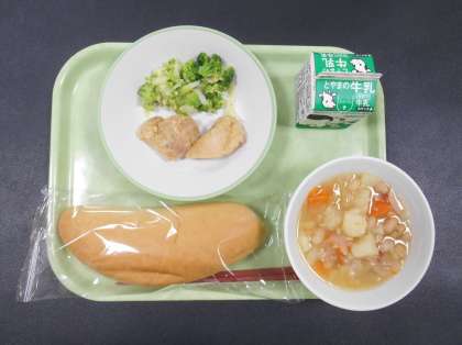 今日の献立は、「コッペパン、牛乳、フライドチキン、そえ野菜、豆とベーコンのスープ煮」でした。