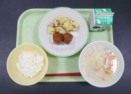 今日の献立は、「ごはん、牛乳、ミートボール、チーズおさつ、豆乳野菜スープ」でした。