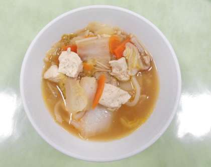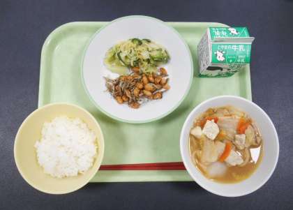 今日の献立は、「ごはん、牛乳、小魚入りフライビーンズ、あわせ和え、はくさいなべ」でした。
