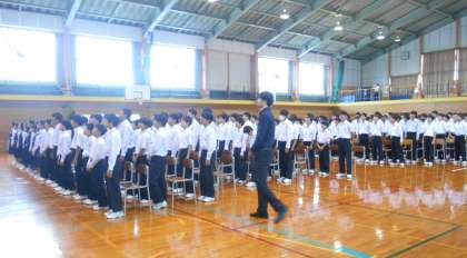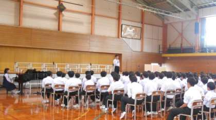 体育館に椅子を搬入した後、合唱コンクール実行委員長から全校生徒へ、明日の合唱コンクールに向けてのメッセージがありました。