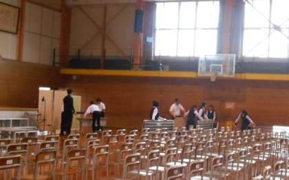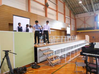 校歌練習の後、合唱コンクール実行委員と2年生を中心に、体育館の会場準備を行っていました。