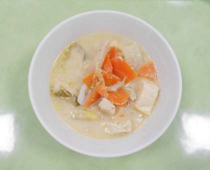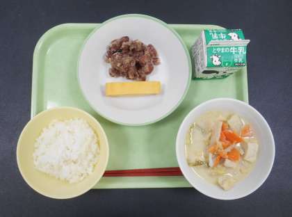 今日の献立は、「ごはん、牛乳、厚焼き卵、煮豆、ごま豆乳鍋」でした。