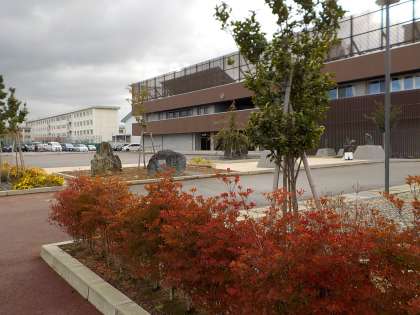 校舎前の垣根には、色づいたドウダンツツジの鮮やかさが映え、秋の深まりを感じます。