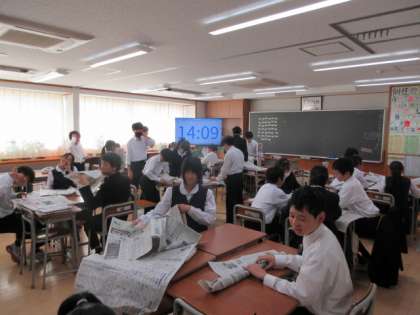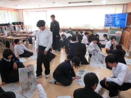 新聞紙を道具なしで積み上げて作るタワーの高さを競う企画を行いました。どの班も一生懸命、創意工夫しながら作り上げていました。