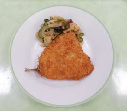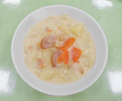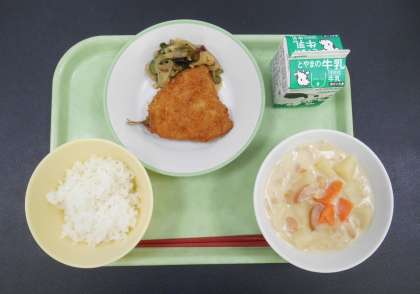 今日の献立は、「ごはん、牛乳、あじフライ、海藻サラダ、クリーム煮」でした。