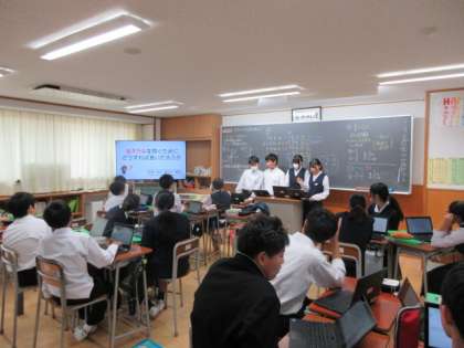 1年生は、総合的な学習の時間で、探究学習の発表リハーサル、資料や原稿の修正を行いました。