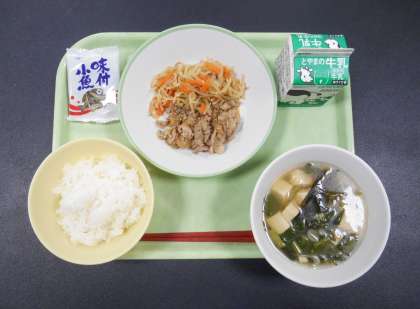 今日の献立は、「ごはん、牛乳、焼肉丼(焼肉)、ナムル、中華スープ、味付け小魚」でした。