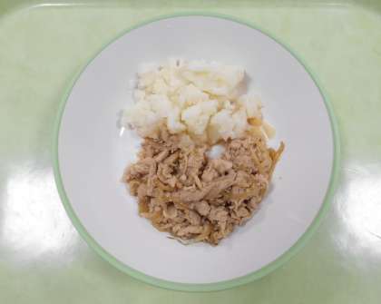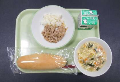 今日の献立は、「コッペパン、牛乳、豚肉の甘辛煮、こふきいも、卵のふわふわスープ」でした。