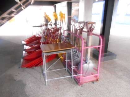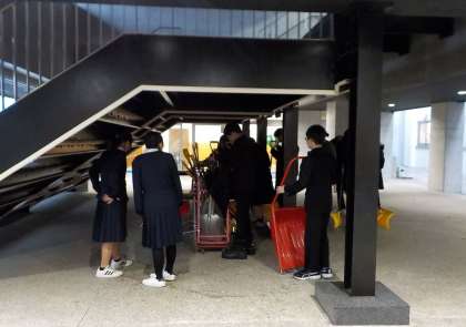 環境委員は、常時活動や予定についての確認の後、除雪用の準備として、スコップやスノーダンプ等を、正面玄関の大階段下に配置する作業をしていました。