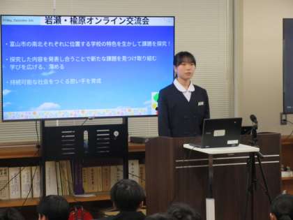 岩瀬中学校からは、「防災」と「伝統文化」についての発表を行いました。発表後の質疑応答では、様々な質問がされ、大変有意義な交流ができました。