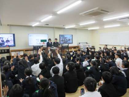 お互いの学校に関するクイズを行った後、それぞれが「総合的な学習の時間」で追究した課題についての発表を行いました。