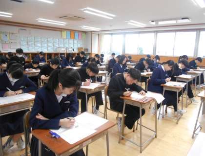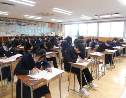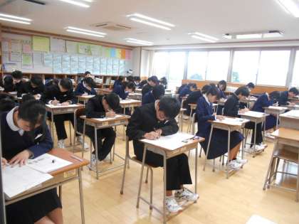 3年生は、1〜5限まで、社会・国語・理科・英語・数学の順で、実力テストを行っています。みんな真剣に集中して問題に取り組んでいます。