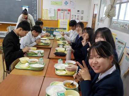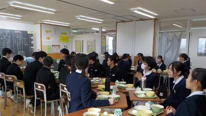 生徒たちは、好きな教科・映画のジャンル・季節について、生徒会アンケートの回答をもとに班分けした座席で、楽しく給食を食べています。
