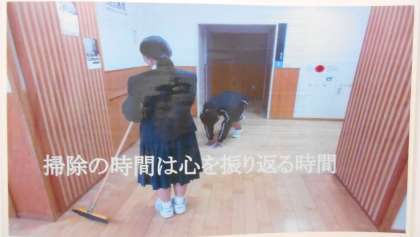 1年生の廊下の掲示物には、「掃除の時間は心を振り返る時間」と書いてあります。