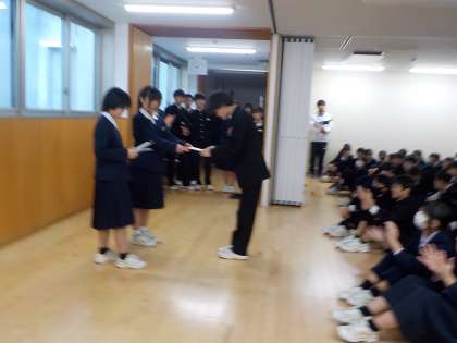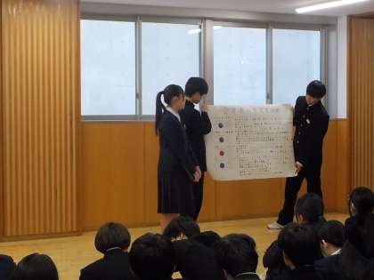 学年生徒会が主となって、2学期を振り返る学年集会を行いました。
