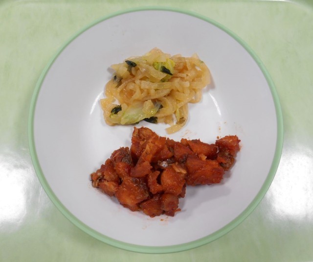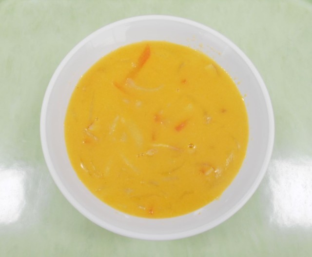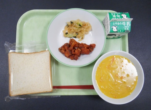 今日の献立は、「食パン、牛乳、ホキのアングレス、海藻サラダ、野菜ポタージュ」でした。