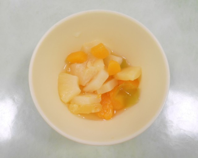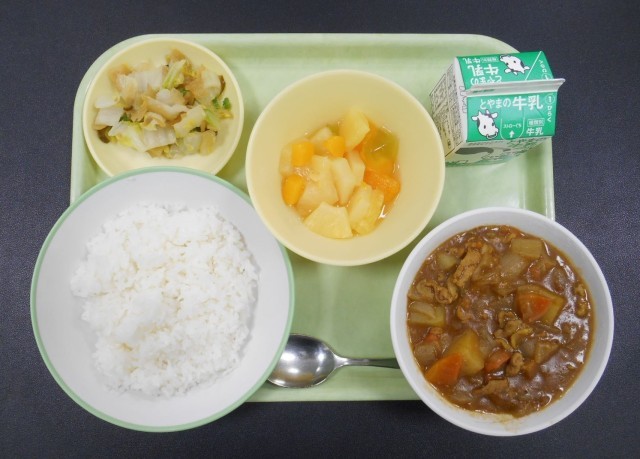 今日の献立は、「ごはん、牛乳、カレーライス、福神和え、フルーツゼリーミックス」でした。