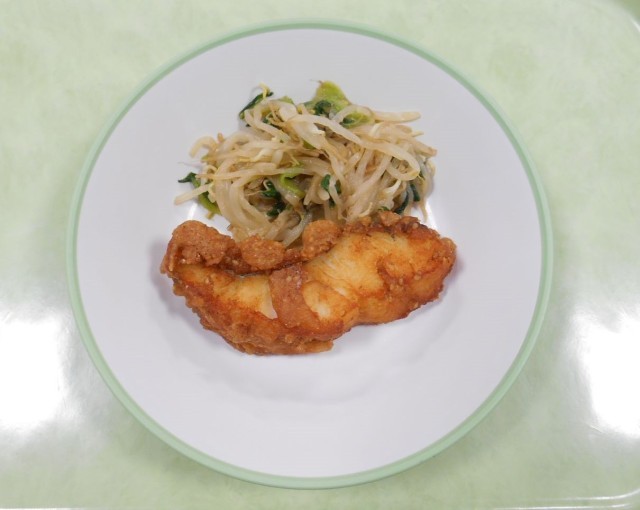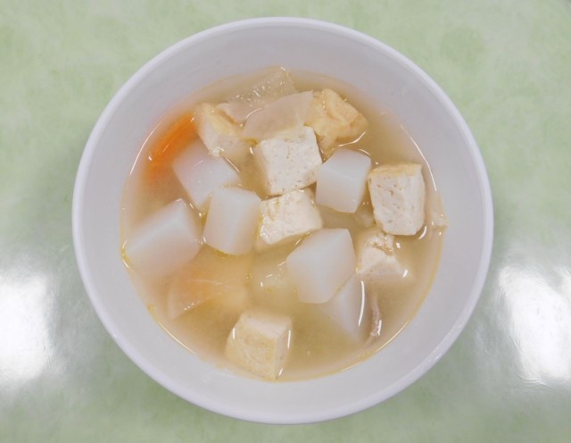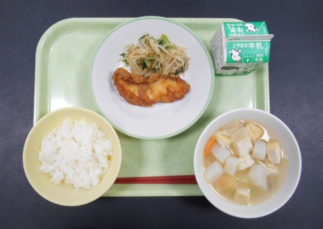 今日の献立は、「ごはん、牛乳、ホキの利久揚げ、もやしのおひたし、豚汁」でした。