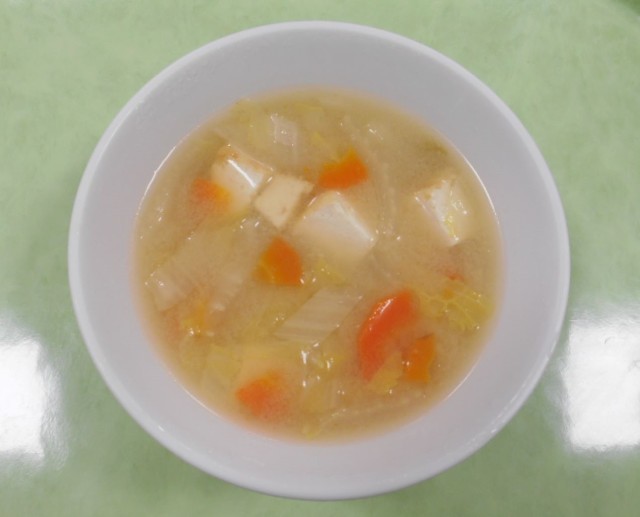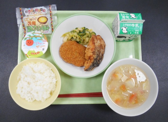今日の献立は、「ごはん、牛乳、和風サラダ、具だくさん汁」と