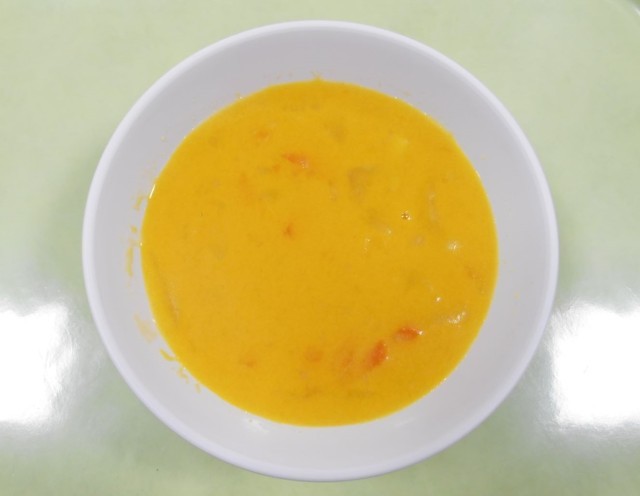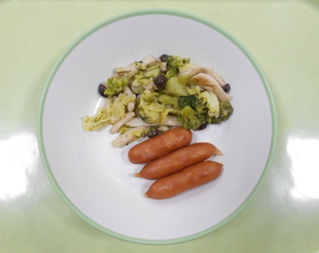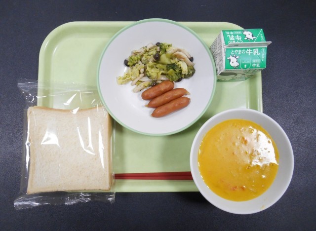 今日の献立は、「食パン、牛乳、あらびきウインナー、ブロッコリーときのこのアヒージョ、かぼちゃのポタージュ」でした。