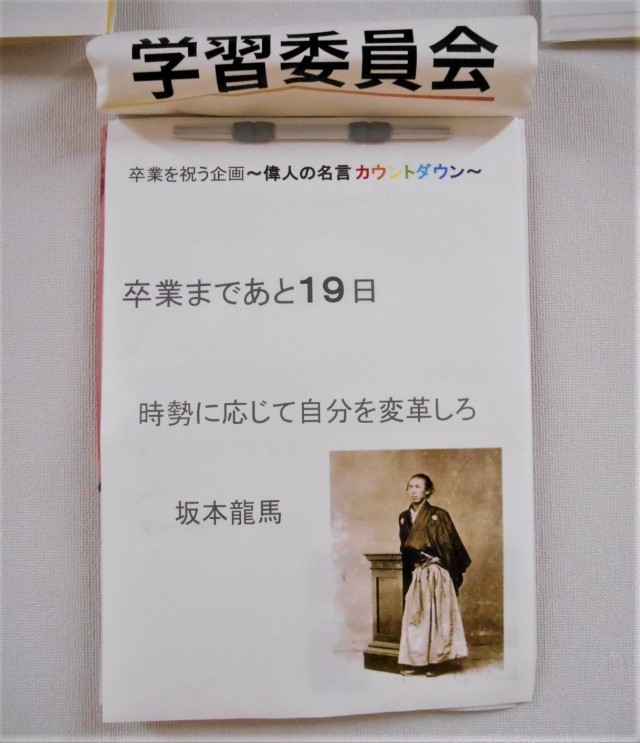 学習委員会では、卒業を祝う企画として、偉人が残した名言を3年生の皆さんに伝える「偉人の名言!」を行っています。