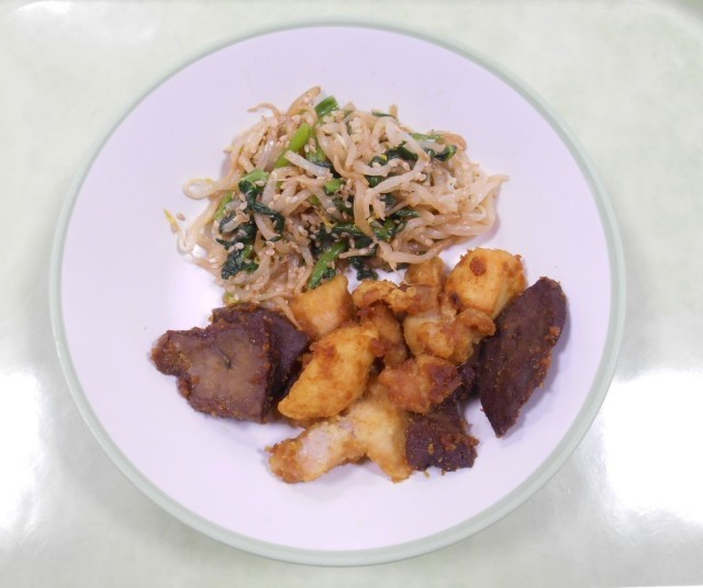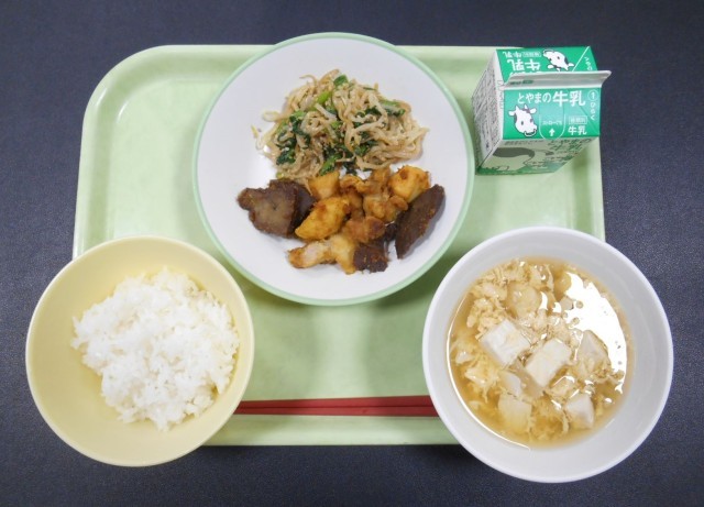 今日の献立は、「ごはん、牛乳、鶏肉とレバーのカレー風味 ナムル かきたま汁」でした。