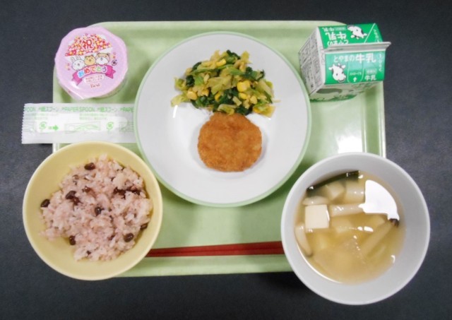 今日の給食 「卒業お祝い献立」 公開日 2025/02/26 更新日 2025/02/26 今日の岩瀬中 2月26日(水)今日の献立は、「赤飯、牛乳、とんかつ、コーン和え、みそ汁、お祝いゼリー」です。今日は、「卒業お祝い献立」です。3年生のみなさんは、給食が食べられるのも、あと8回です。栄養バランスが整った給食に感謝しながら、味わっていただきましょう。 +2