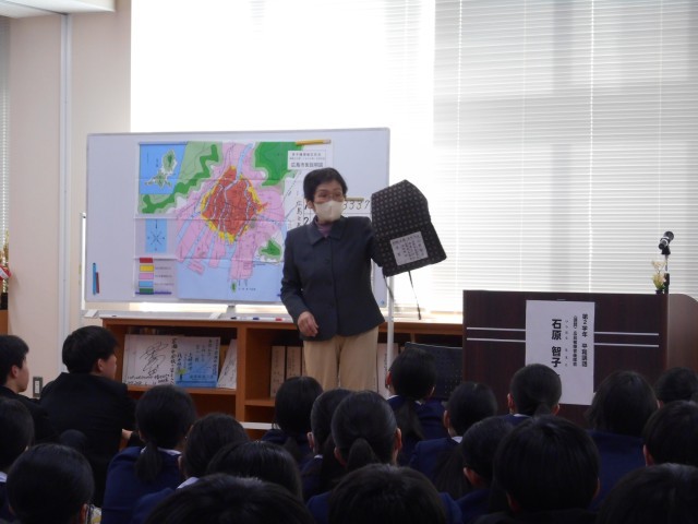 2年生は、平和学習の一環として、広島から石原智子先生をお迎えし、講話をしていただきました。