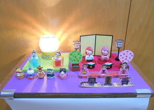 用務員さんが3年生側の玄関前廊下に、ひな人形を飾ってくださいました。