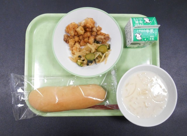 今日の献立は、「コッペパン、牛乳、鶏肉と豆のハニーマスタードからめ、大根サラダ、クリームスープ」でした。