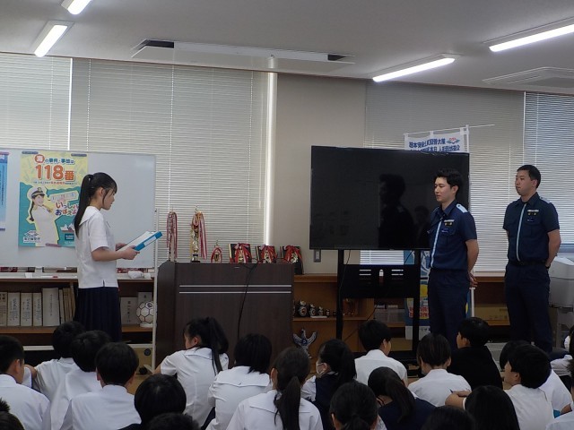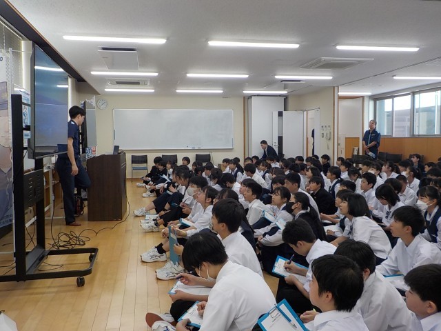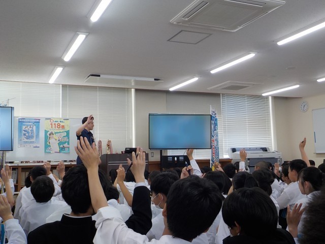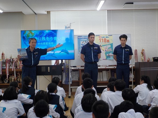 1年 海岸の漂着物についての講演会 公開日 2025/05/28 更新日 2025/05/28 1年 5/28(水)5限 総合の様子です。伏木海上保安部の方に海岸の漂流ゴミについて、お話しいただきました。漂流ゴミや海洋汚染など、現在ある日本の海洋問題を学びました。来週の岩瀬浜清掃に向けて、意識を高めていきましょう! +2