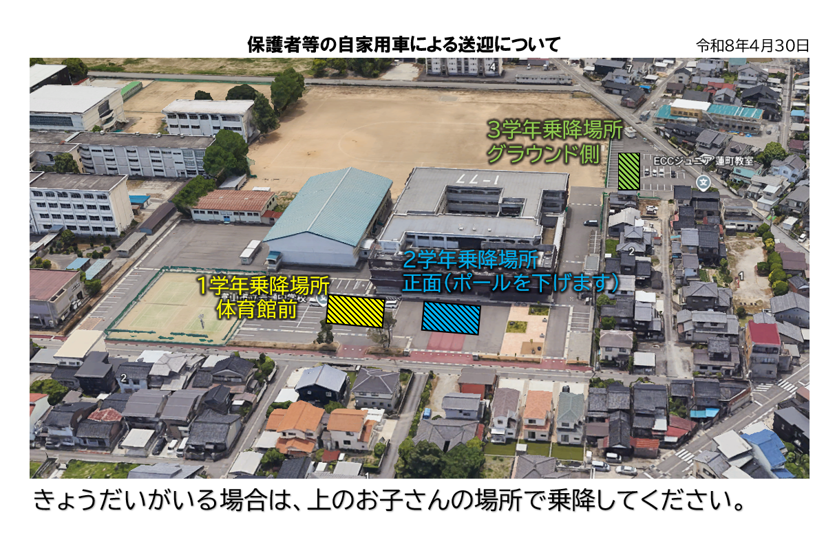 【全校生徒の保護者の皆さまへ】※保護者送迎場所をご確認ください。 本日4月30日(木)の予定は、次の通りです。【1】授業時間等 ~9:10までに登校 2限 9:20~10:05 3限 10:15~11...