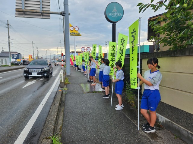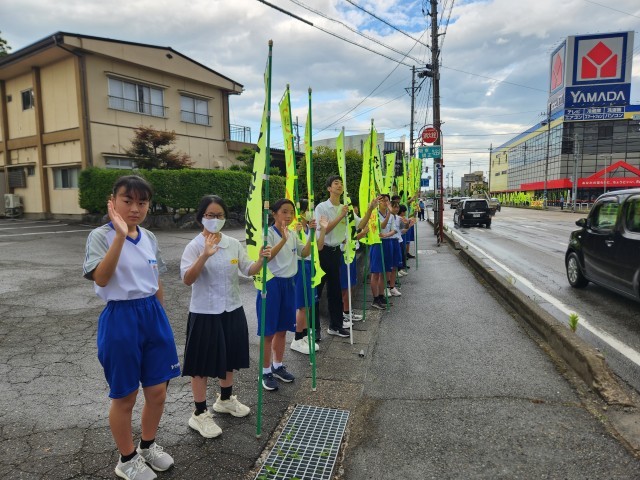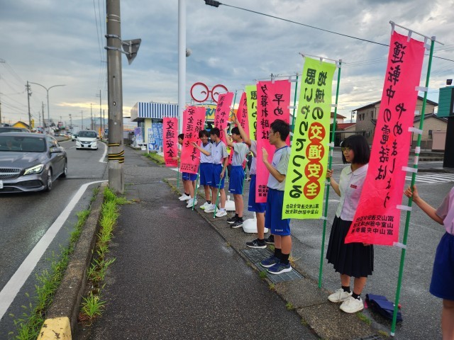 交通安全人波作戦に参加 公開日 2025/07/16 更新日 2025/07/16 山室中学校のページ 7月16日(水) 7:30 夏の交通安全週間に行われた交通安全人波作戦に参加しました。60名余りのボランティア生徒が富山南交通安全協会の方々と一緒に、のぼり旗をもち、交通安全を呼び掛けました。地域のために活動できる機会をいただき、ありがとうございました。