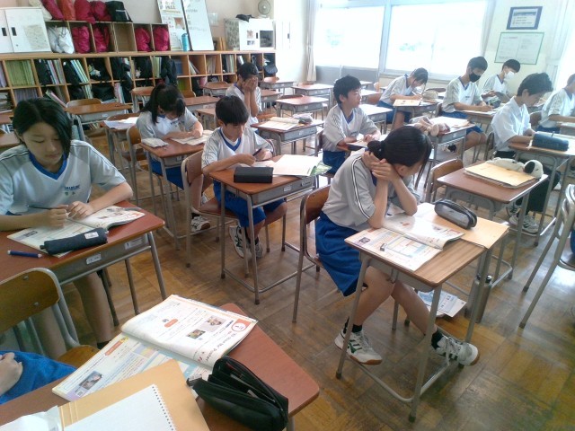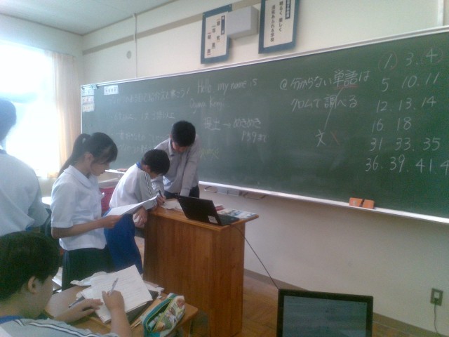 1年・英語・All About Me 公開日 2025/07/18 更新日 2025/07/18 1学年 7月18日(金) 1限 1年4組の英語の授業(少人数)です。"All About Me"と題し、自己紹介文を作っています。自分の好きな食べ物や部活動で頑張っていることについて、調べたり先生に質問したりしながら英文を作っていきます。