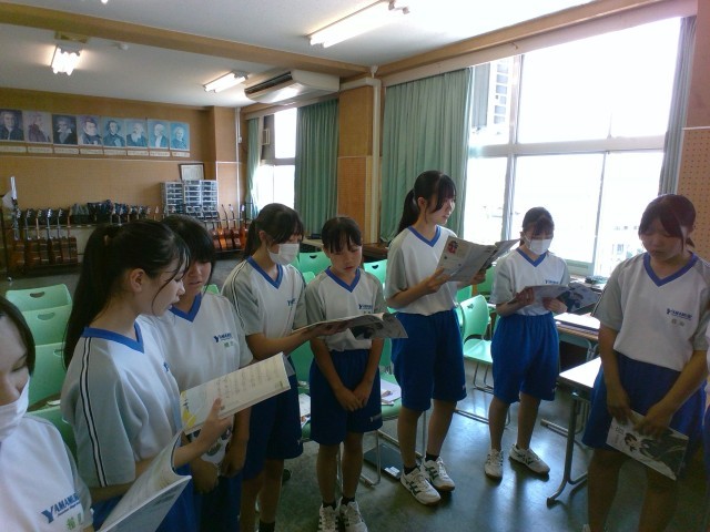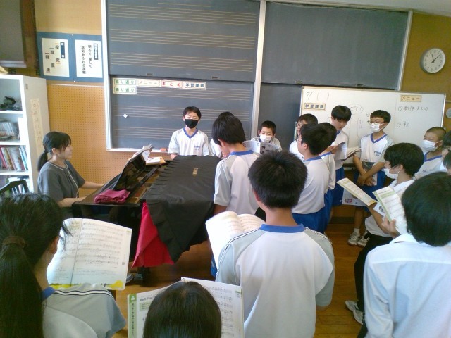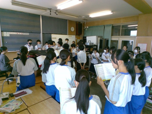1年・音楽・合唱 公開日 2025/07/22 更新日 2025/07/22 1学年 7月22日(火) 3限 1年2組の音楽の授業です。「We'll find the way」、「浜辺の歌」といった合唱曲を歌っています。フレーズの終わりの拍数を意識して声を響かせることや、ブレスの位置等に気をつけて歌っています。