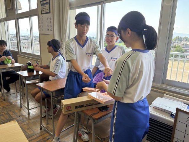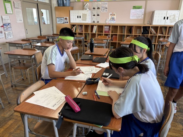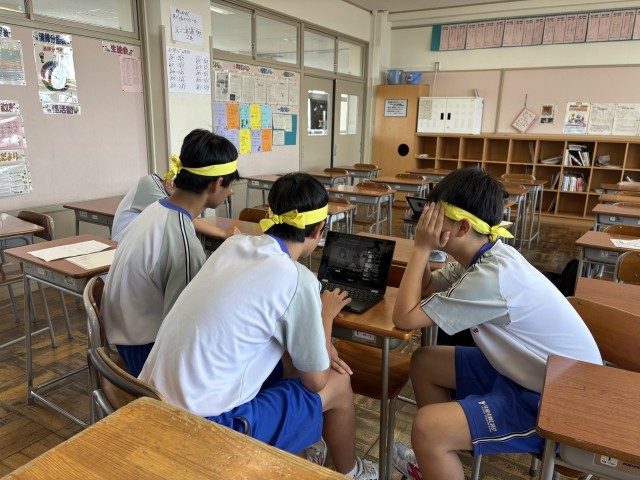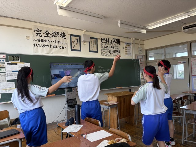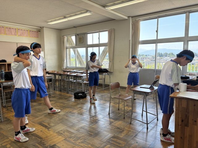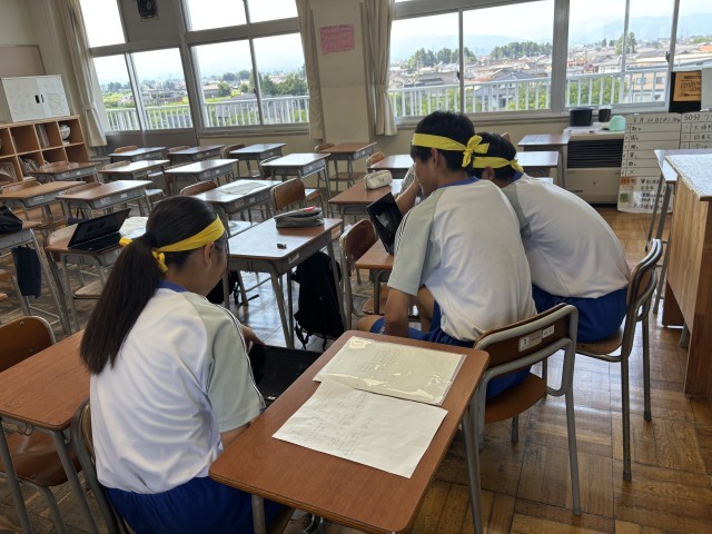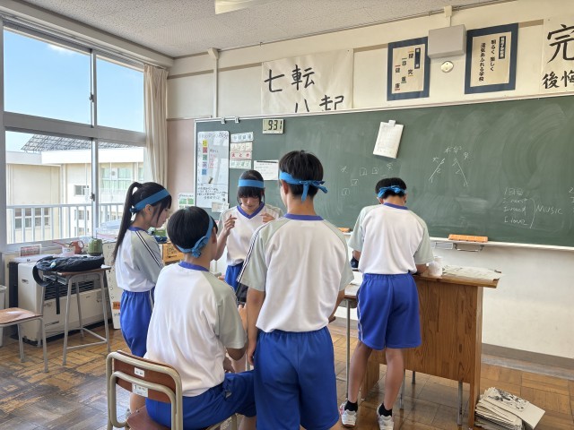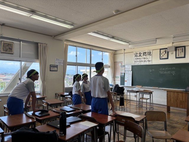 3年・団活動・その1 公開日 2025/07/30 更新日 2025/07/30 3学年 7月30日(水) 9:00 3年生の団リーダーが、2学期に向けて団演技の構成や振り付けを考えていました。どの団も工夫を凝らし、話合いをしたり、実際に踊ったりしながら考えていました。明日も団活動があるので、体調に気を付けながら元気に学校に来てください。 +7