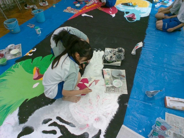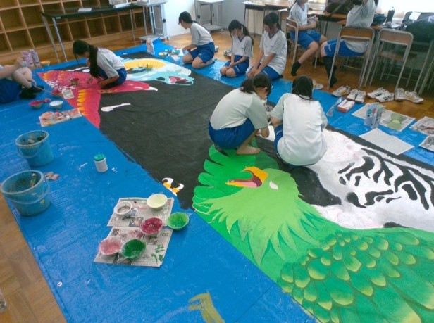 体育大会準備・デコレーション係の活動 公開日 2025/07/31 更新日 2025/07/31 山室中学校のページ 7月31日(木) 9:30 美術部を中心としたデコレーション係が、体育大会のデコレーションを作成しています。鳳凰の燃えるような炎をグラデーションで描いたり、筆を毛羽立たせることで虎の柔らかな毛並みを表現したりしています。同じ色に見えるところも、微妙に異なる色を重ねて塗ることで立体感を出しています。