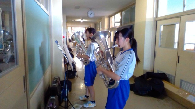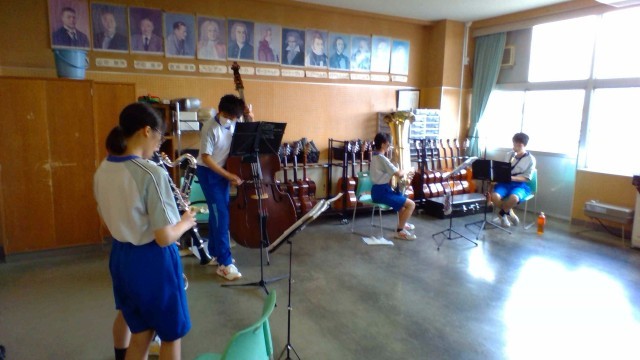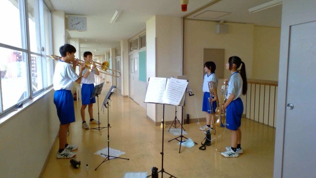 8月8日(金)の部活動・その2 公開日 2025/08/08 更新日 2025/08/08 部活動 8月8日(金) 13:30 吹奏楽部の活動の様子です。各パートに分かれ、互いの演奏を聴き合って技術を磨いています。