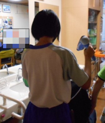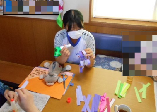 社会に学ぶ「14歳の挑戦」・グループホーム中川原の家 公開日 2025/09/03 更新日 2025/09/03 2学年 9月3日(水) 3日目【グループホーム中川原の家】 入居者の方の髪を乾かしたり、飾りの作成をしています。このほかにも血圧を測ったり、入居者の方とお話をしたりしているようです。職員の方は、一生懸命働いてくれて助かっているとおっしゃっておられました。