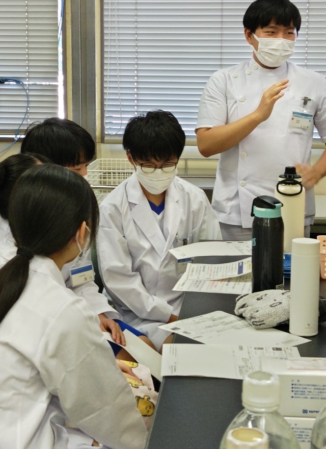社会に学ぶ「14歳の挑戦」・富山市民病院 公開日 2025/09/03 更新日 2025/09/03 2学年 9月2日(火) 2日目【富山市民病院】 薬剤師の方から説明を受けています。真剣な面持ちで聞いています。この後、患者さん役と薬剤師さん役とに分かれて、お薬の説明をする体験をします。正しく薬の情報を伝えられるか緊張します!