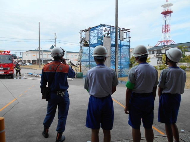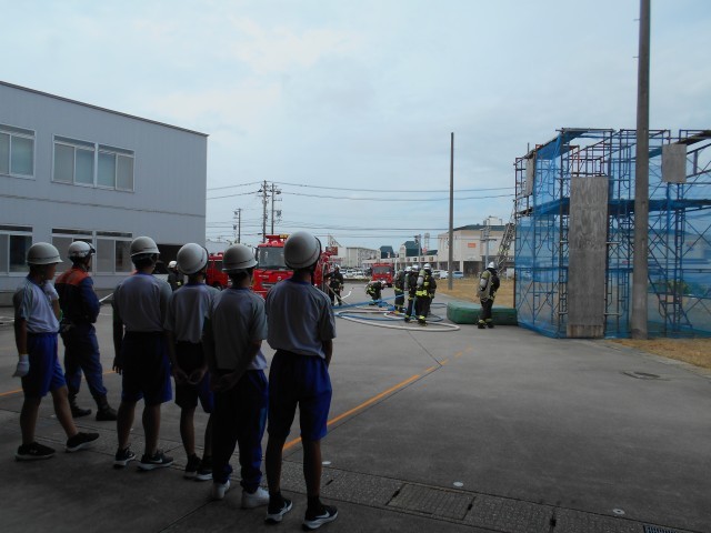 社会に学ぶ「14歳の挑戦」・富山消防署 東部出張所 公開日 2025/09/04 更新日 2025/09/04 2学年 9月3日(水) 3日目 消火活動の訓練に参加せてもらいました。火災発生から負傷者の救出までを体験し、迅速な連絡、落ち着いた的確な行動、そしてチームワークの大切さを学ばせてもらいました。