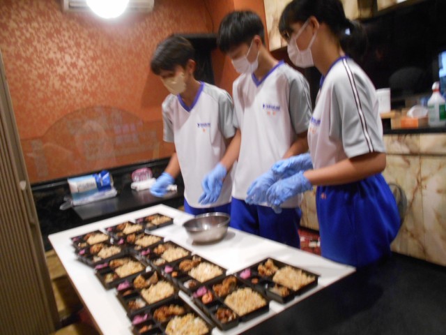 社会に学ぶ「14歳の挑戦」・中国酒家新三陽 公開日 2025/09/04 更新日 2025/09/04 2学年 9月4日(木) 4日目【中国酒家 新三陽】今日はお弁当を詰める作業を行いました。酢豚の具材を均一にすること、炒飯は空気を入れて盛ること、最後に蓋をすることを想定した盛り方にするなど、気を付けながらお弁当を完成させました。お客さんに喜んでいただくために、サラダの彩りを試行錯誤しながら盛り付けました。お店の方に、魚の種類を尋ねたり、包丁さばきを間近で見学したり、楽しく活動しました。