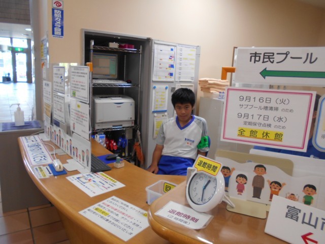 社会に学ぶ「14歳の挑戦」・富山市民プール 公開日 2025/09/04 更新日 2025/09/04 2学年 9月4日(木) 4日目 【富山市民プール】50mメインプールと25mサブプールの監視、プール受付、フィットネス受付のそれぞれの業務を4人ローテーションで行っていました。ほかにも、水中ウオーキング教室や筋膜リリース教室にも参加させてもらいました。プールは暑くて大変だけど、いろいろな体験ができて楽しいと言っていました。 +1