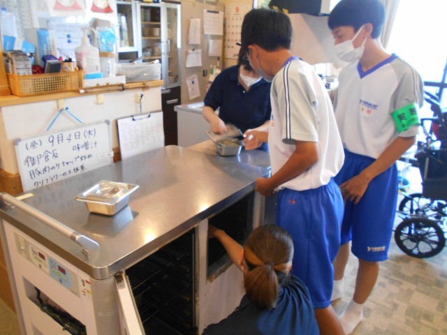 社会に学ぶ「14歳の挑戦」・射水万葉会天正寺サポートセンター 公開日 2025/09/04 更新日 2025/09/04 2学年 9月4日(木) 4日目 【射水万葉会天正寺サポートセンター】男子はグループホームで、お風呂場の説明をうけて、タオルを干すお手伝いをしました。その後は利用者さんとお喋りを楽しみました。女子はデイサービスで、職員の方に教わりながら、豆腐を使ったチョコレアリーズケーキ作りをしました。出来上がりが楽しみです。