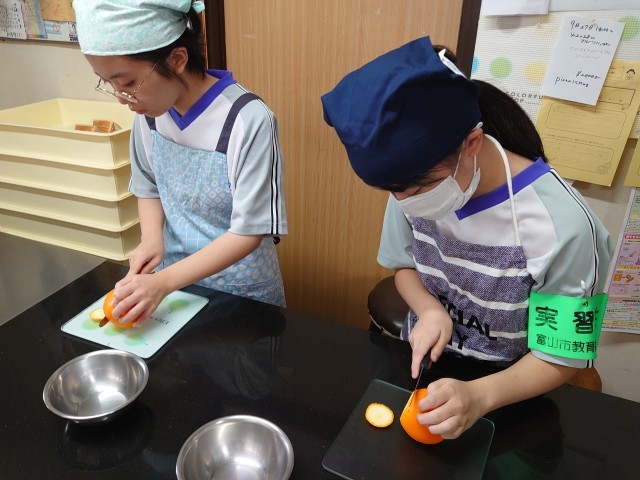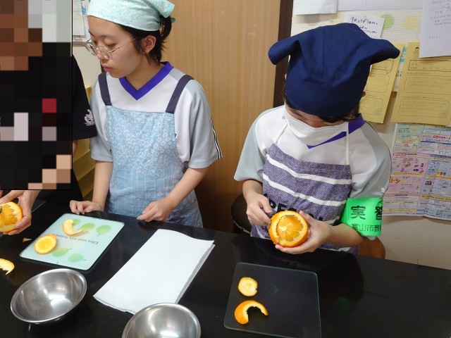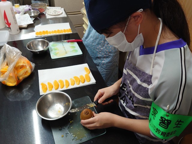 今日は、最終日ということでそれぞれの保護者の方にケーキを作っていました。フルーツを切るのは刃の部分がギザギザになっている包丁で、慎重に皮を剝いていました。