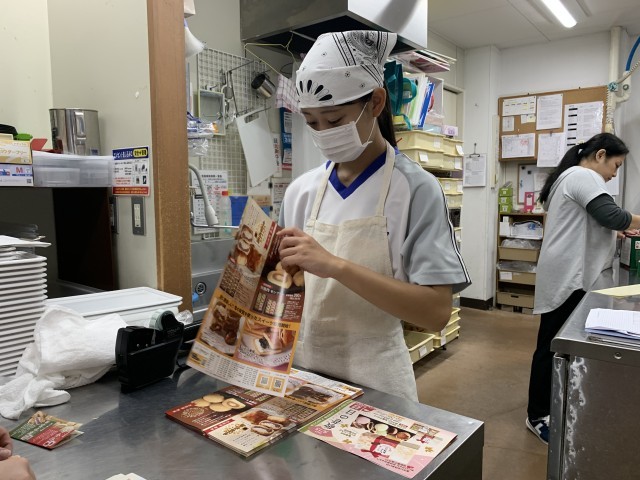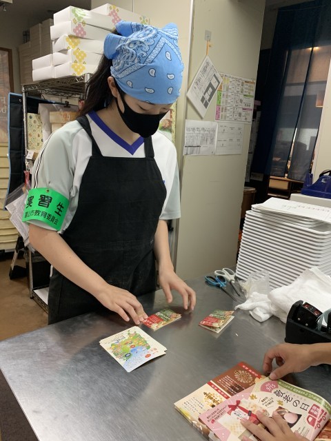 パンの袋詰め、焼き菓子の検品作業、チラシの折り込み等、午前だけでもたくさんの仕事を容量よく行っているとお店の方から嬉しい言葉をいただきました。この活動中に作成した新商品の紹介用ポップもすでに商品棚に置かれており、本人たちも嬉しそうにしていました。「ずっと働いていたい」と口にするほど、本人たちにとって、この数日間が楽しく、有意義なものになったようです。