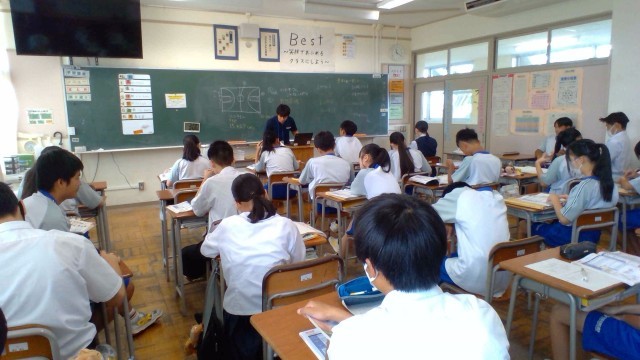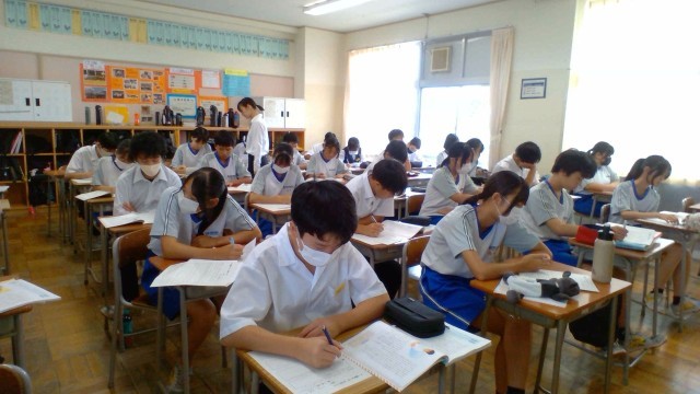2年・授業風景 公開日 2025/09/08 更新日 2025/09/08 2学年 9月8日(月) 3限 2年生の授業の様子です。先週の「14歳の挑戦」から気持ちを切り替え、学習に取り組んでいます。 (写真 上:2年3組 道徳「一冊のノート」)(写真 中:2年4組 体育「バスケットボール」)(写真 下:2年5組 英語「世界のおもしろい校則」)