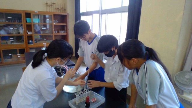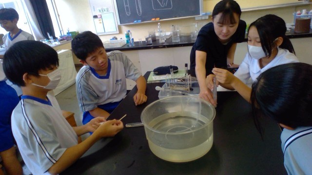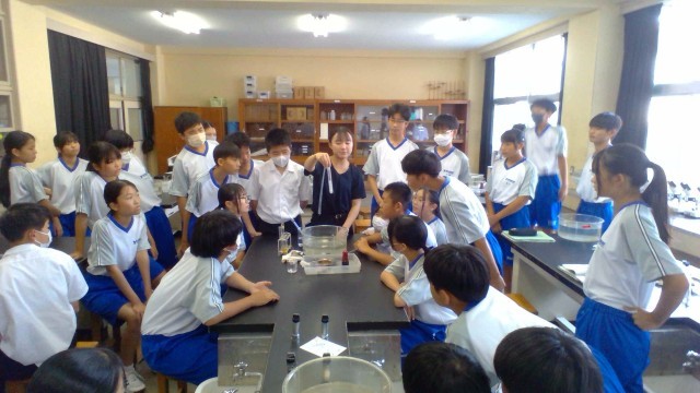 1年・理科・二酸化炭素の性質 公開日 2025/09/09 更新日 2025/09/09 1学年 9月9日(火) 2限 1年3組の理科の授業です。二酸化炭素の性質を調べるため、様々な実験を行っています。班で協力して二酸化炭素を集めたり、BTB溶液や線香の火の変化に目を丸くしたりと、生徒たちは楽しそうに取り組んでいました。